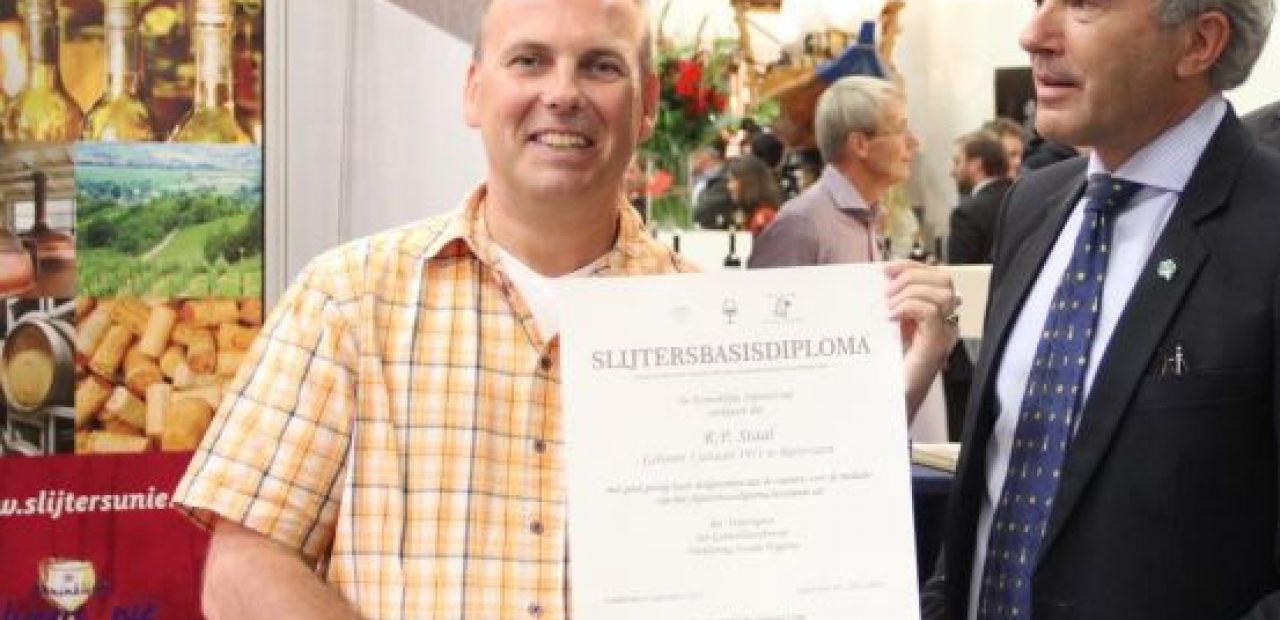 Houten, 6 september 2015. Vandaag werd op Dranken en Pakket Expo 2015 het eerste SLIJTERSBASISDIPLOMA uitgereikt. Ronald Staal (44) uit Ridderkerk ontving het document uit handen van SlijtersUnie voorzitter Ron Andes. De brancheorganisatie introduceerde dit nieuwe diploma om het drankenonderwijs te stimuleren. Staal kwam in aanmerking voor het diploma omdat hij drie modules; ‘Ik weet wat van wijn’, ‘Ik weet wat van sterke drank’ en de voor alcoholverstrekkers verplichte Verklaring Sociale Hygiëne positief had afgerond. Het Slijtersbasisdiploma vormt een opstap naar het Slijtersvakdiploma. De eerste kandidaat is zeker van plan hiervoor door te gaan om een carrière in slijtersbranche te verzekeren.